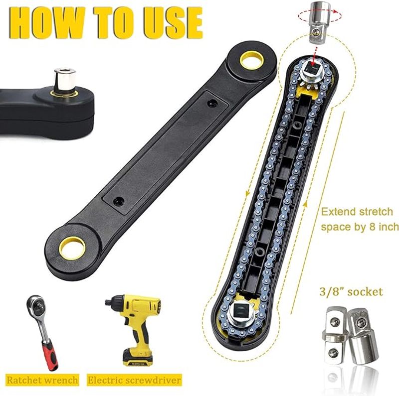 Utvid rekkevidden til 8 tommer. Gi skrallen nok bevegelse for en jevn arbeidsflyt. Spar skjøter og spar tid. Drei muttere og bolter i null buer. Løsne raskt bolter og muttere i vanskelige vinkler.